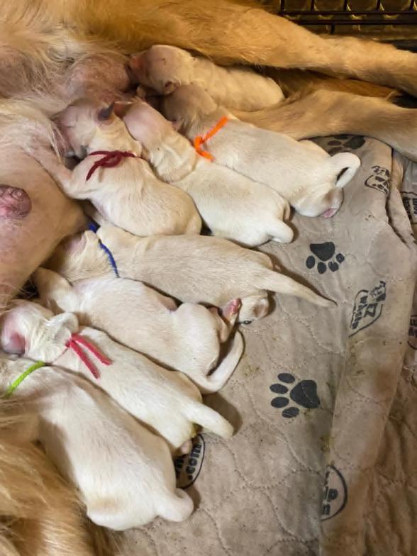 Nothing like a pleasant surprise to greet you on a Sunday morning!! Amber & Marshall are the proud parents of eight Golden Retriever pups! Born 11-2-25, we have four boys & four girls! Mom and pups are all doing well! These pups are Champion Grandsired and will be RTG at eight wks of age, Dec. 28th. Colors range from nearly white to light golden. Please call for details!